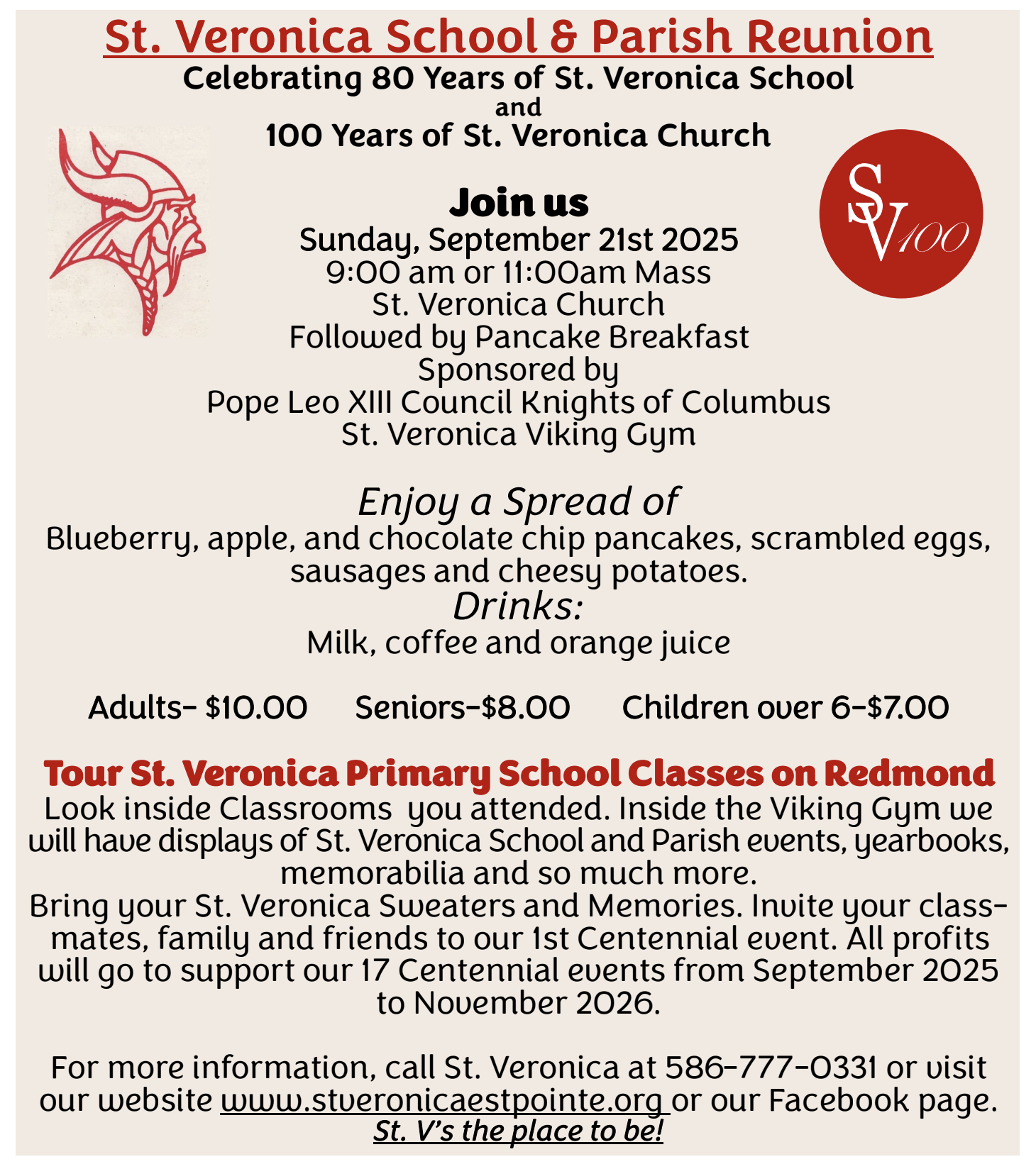 Before or following Mass, enjoy a delicious Pancake Breakfast in the Parish Gym! This breakfast is sponsored by the Knights of Columbus/Leo XIII Council, and all proceeds will benefit St. Veronica's Centennial Celebration in 2026.